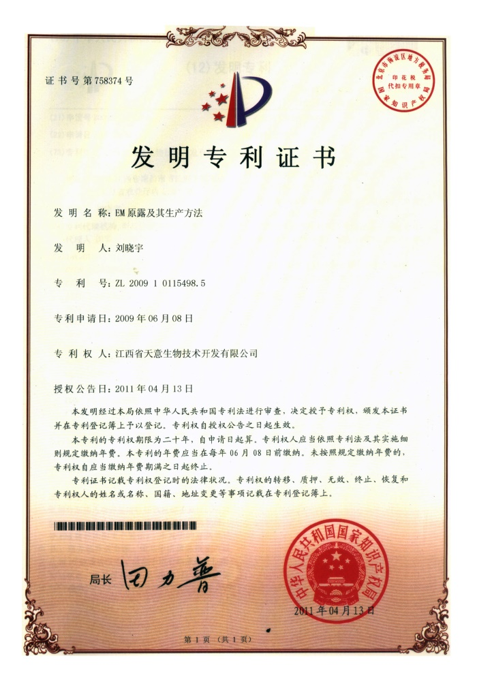 天意生物集團始終堅持EM環保理念,時刻不忘從里到外將國外先進技術打造成中國品牌,經過多年不懈努力,終于攻克并掌握了EM原露的生產方法,并由此開發系列產品,獲得國家多項發明專利(專利號:ZL 2009 1 0115498.5、ZL 2009 1 0115434.5、ZL 2009 1 0115433.0),產品品質已完全超越其技術母國——日本,真正做到了知識產權的全部自有化,創造出了屬于中國的EM技術生態圈。