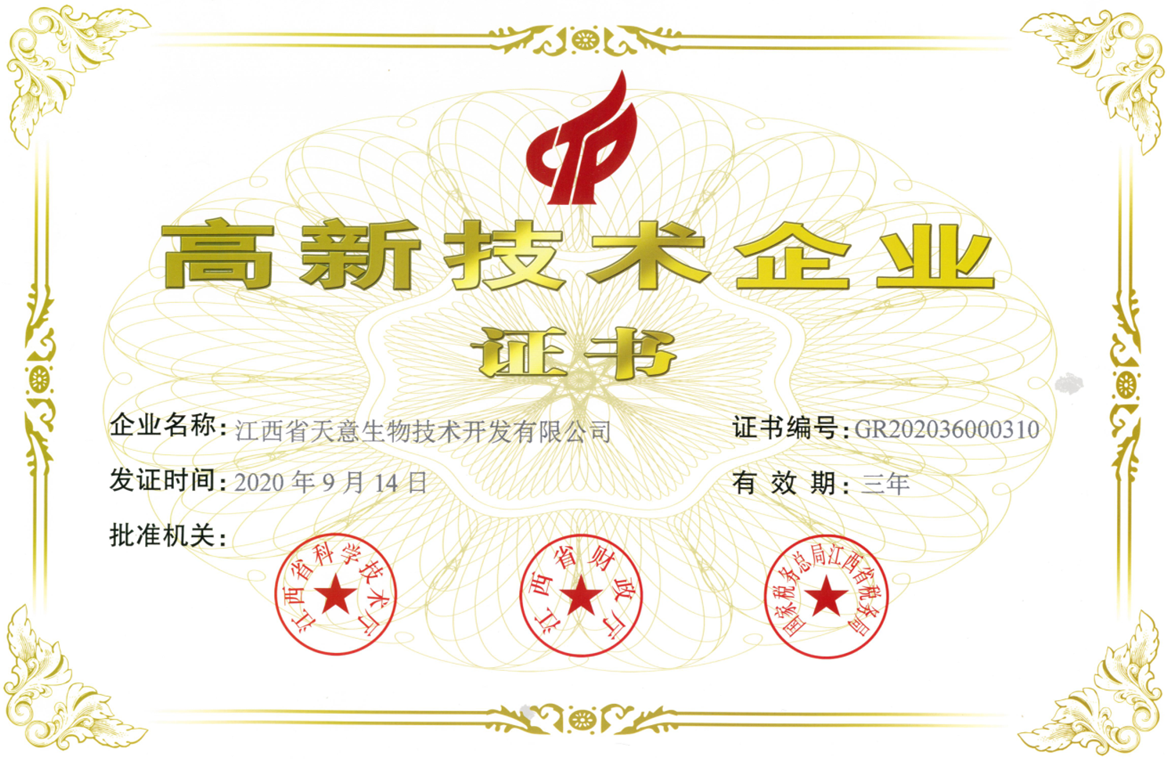 江西天意生物技術開發有限公司榮獲國家高新技術企業